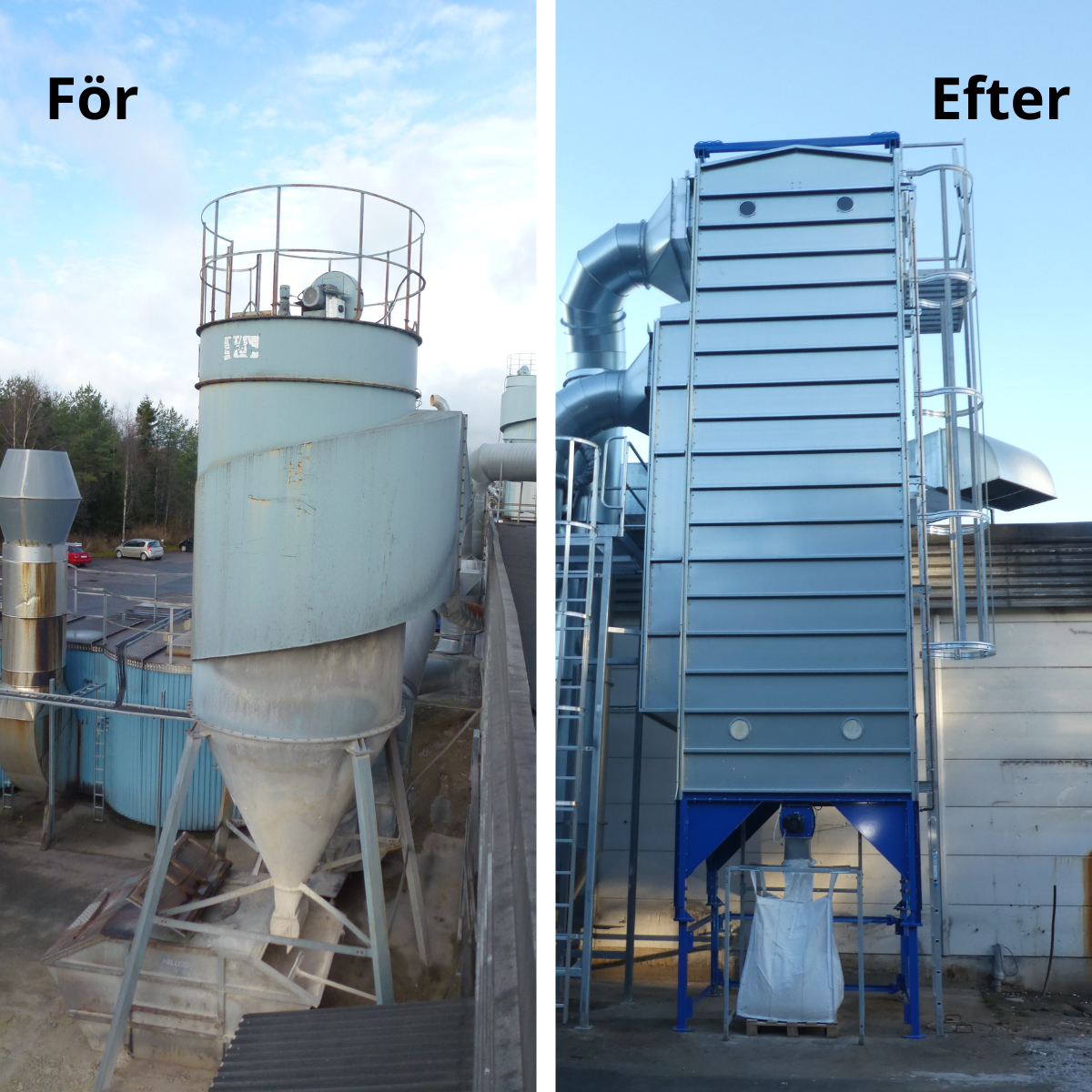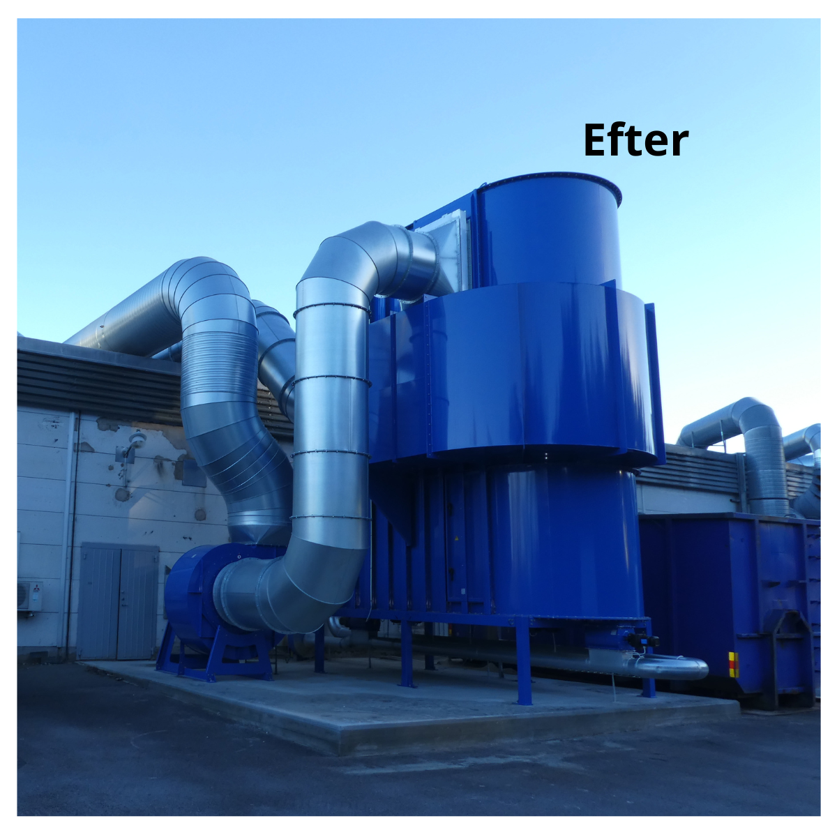 Utsugning från olika bearbetningsprocesser via vakuumfilter, där låga drifts- och underhållskostnader var av största vikt. I en behållare förvaras spån som transporteras via en ringledning från filtret med hjälp av luft. Automatiska spjäll i kombination med frekvensstyrd fläkt garanterar energieffektiv drift. Returluft till produktionsbyggnader direkt från filter.