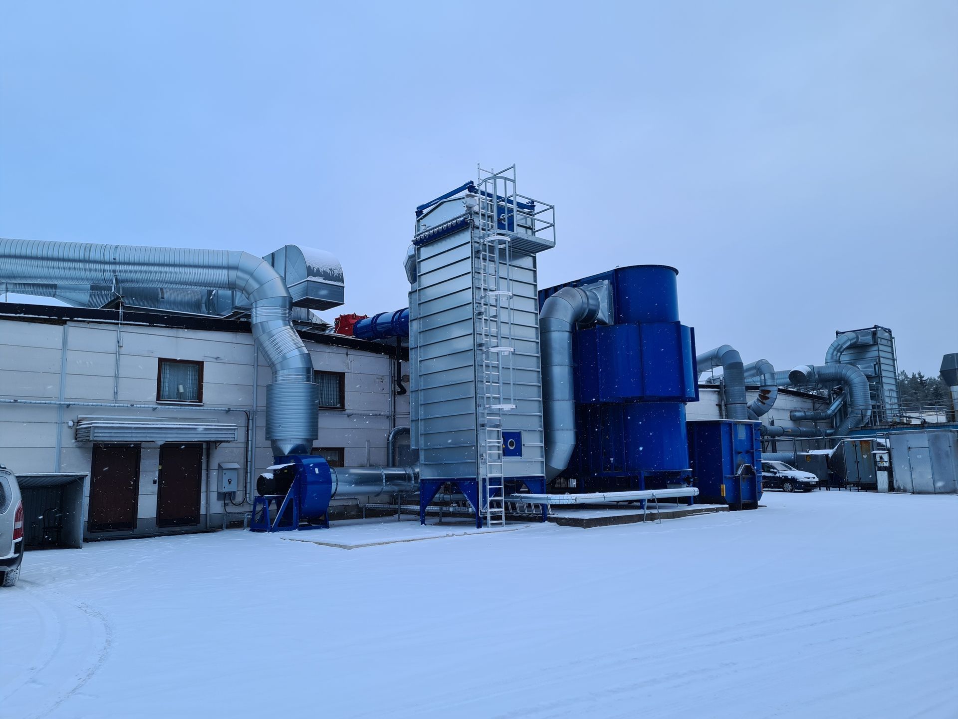 Som det kan ses i baggrunden har vi leveret to andre filteranlæg tidligere for hhv. lakudsugning og spånudsugning, hvor kunden nu fik behov for yderligere kapacitet.